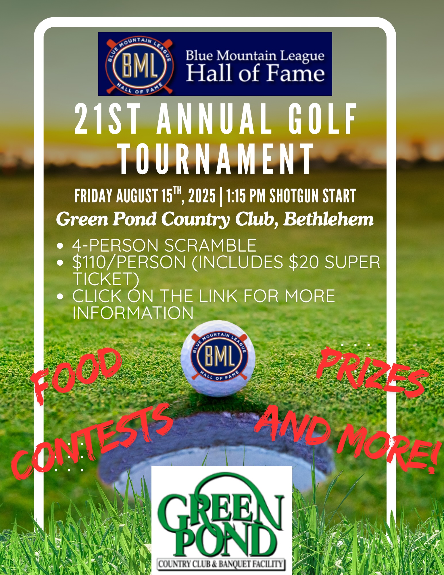 The 2025 Blue Mountain League Hall Of Fame Golf Tournament will be held on Friday, August 15, 2025 at Green Pond Country Club in Bethlehem, PA. The shotgun start time will be 1:15 pm.